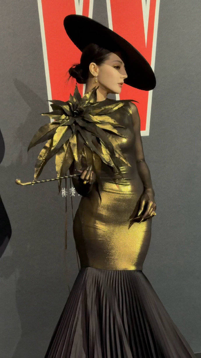 实际上,所谓的“礼服撕裂”纯属谣言。迪丽热巴此次的造型堪称时尚与艺术的完美结合,金腰封勒出教科书级别的腰臀比,下半身黑色百褶裙飘逸灵动,最绝的是那顶圆形礼帽和同色系烟斗,将复古魅力与现代时尚完美融合。她转烟斗的动作更是让现场观众眼前一亮,仿佛一位充满魅力的复古女郎散发着无与伦比的吸引力。这种暗黑风格的驾驭力,成功逆转了此前粉丝对其造型师闵塔鲨的负面评价。此前闵长期被批依赖纱裙和公主风格,未能充分展现迪丽热巴明艳的特质,而这次的造型彻底打破了大家的固有印象。